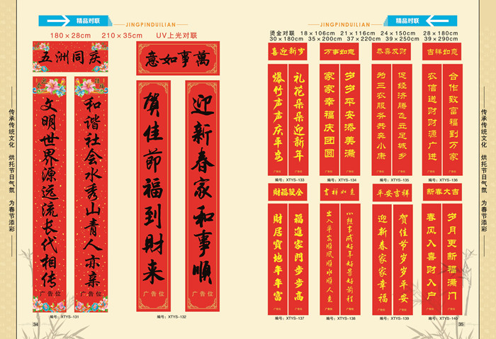 燙金春聯(lián)有平面燙金、浮雕燙金。電化鋁燙印顏色有:黑金、金黃、金色、鐳射金。