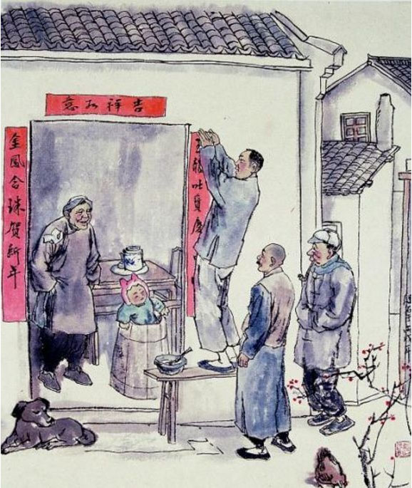 宋代,人們開始在桃木板上寫對聯(lián),一個不失桃木鎮(zhèn)邪的意義,二個表達(dá)自己的美好愿望,三個裝飾門戶,以求美觀。在象征幸福和吉祥的紅紙上寫對聯(lián),貼在門窗兩側(cè),表達(dá)人們祈求來年好運(yùn)的好愿望。唐朝以后,除了以往的神茶和郁郁蔥蔥的二將,人們還把秦叔寶和尉遲恭作為門神。傳說唐太宗病了,聽到門外的鬼魂呼號,他整晚都不安。于是他讓這兩位將軍手里拿著武器站在門口,第二天晚上就再也沒有鬼魂了。后來,唐太宗讓人們在門上畫出這兩位將軍的形象,這一習(xí)俗開始在人們中廣泛傳播。